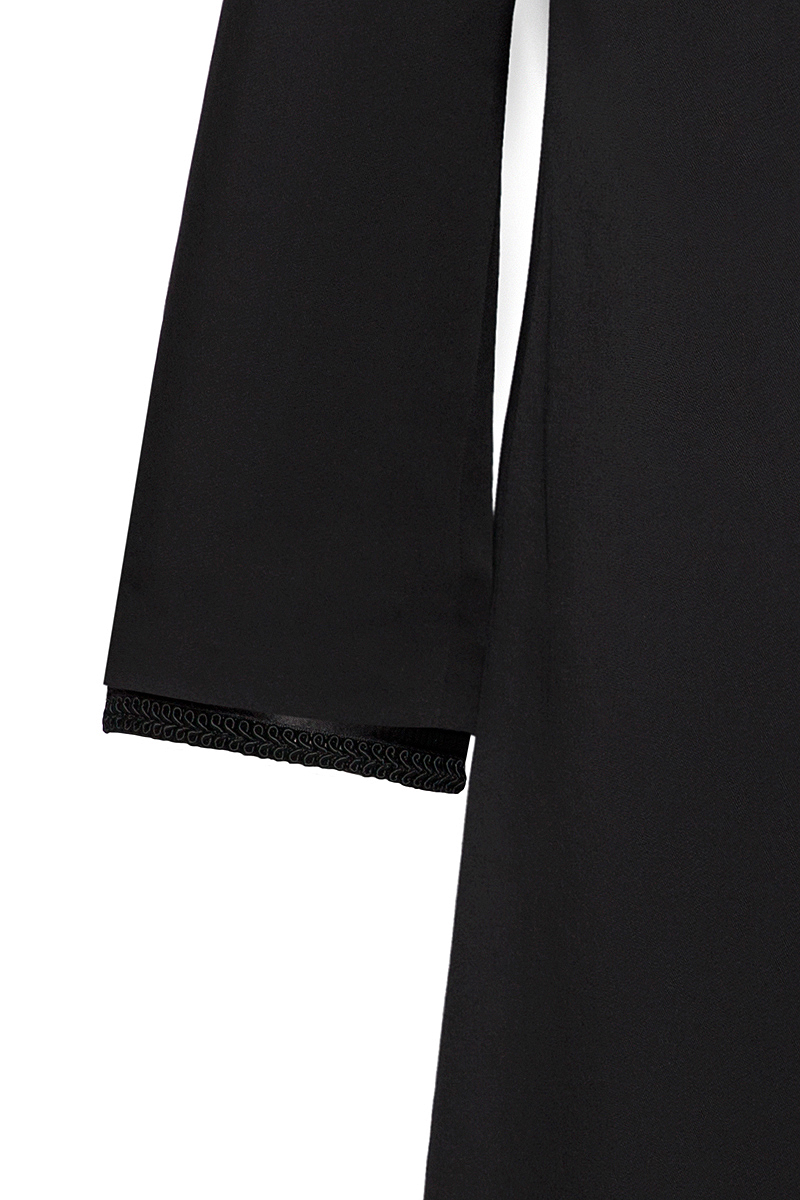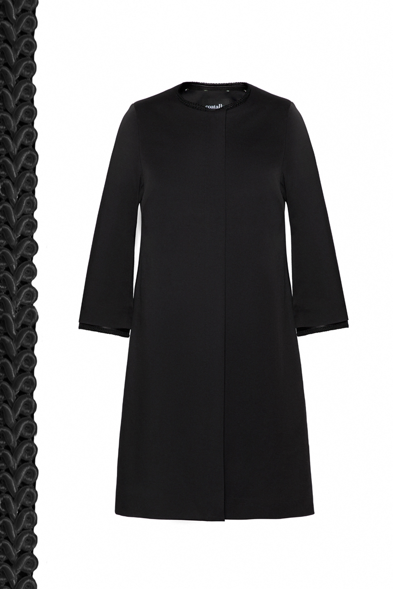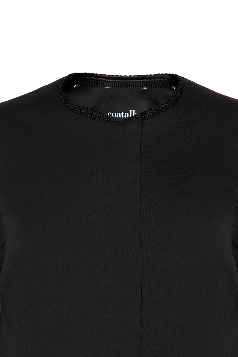 This female black coat made of highly resistant material in black color with detachable set of collar and ¾ sleeves designed with a black braided ribbon. Above-knee length. Concealed YKK zipper closure. Fully lined.