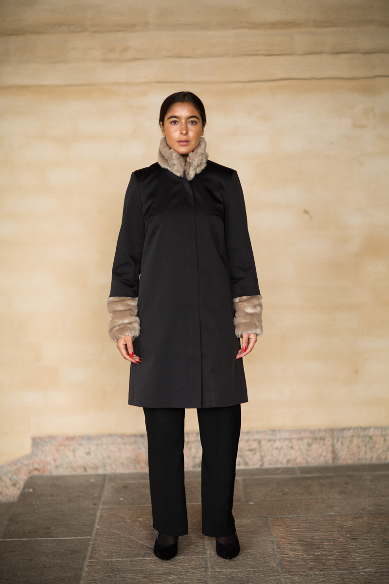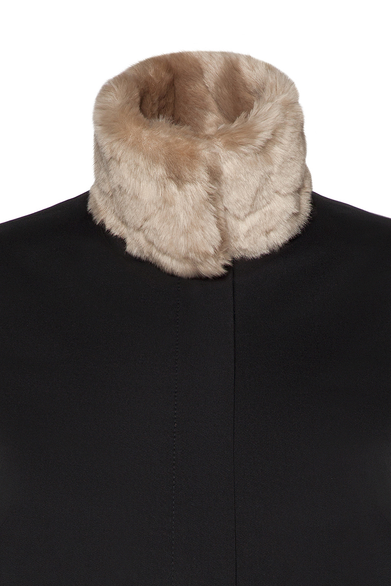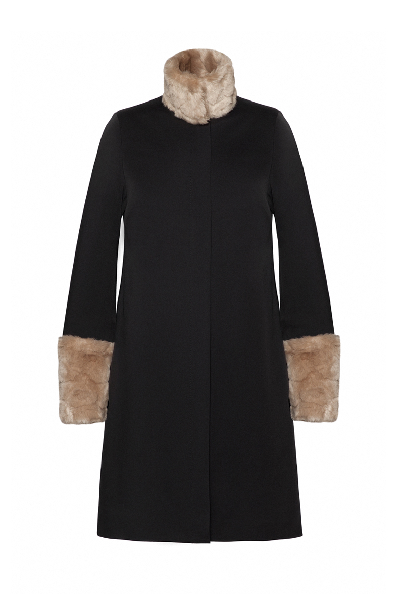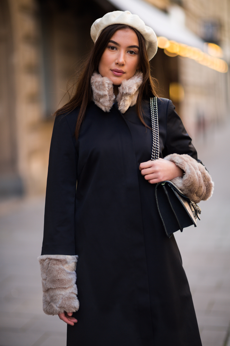 Meet your new favorite winter black coat is this season. It has an above-knee length and a beautiful detachable beige faux fur sleeves and collar to protect you and keep you warm on these winter days.