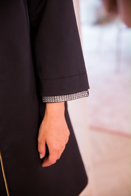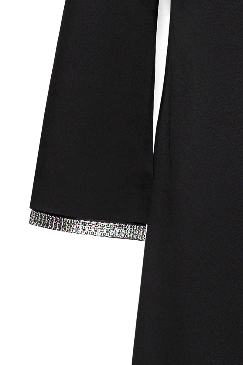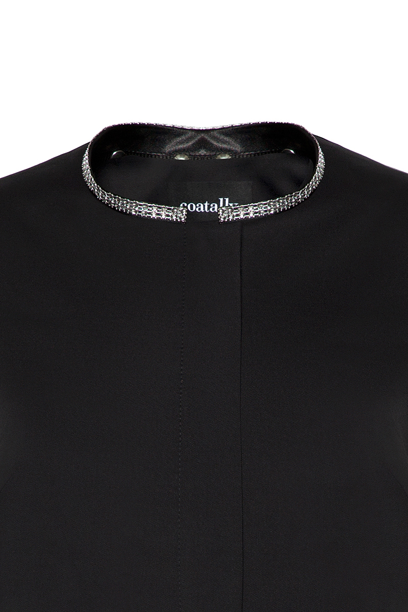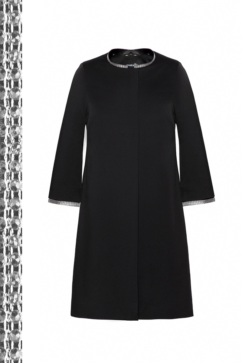 This classical black coat with ¾ sleeves is designed with a straight elegant silhouette. It has shiny, sparkling details for more exclusive look. This coat is finished with side sewed, deep pockets. Fully lined. Shoulder pads. Hidden YKK zipper.