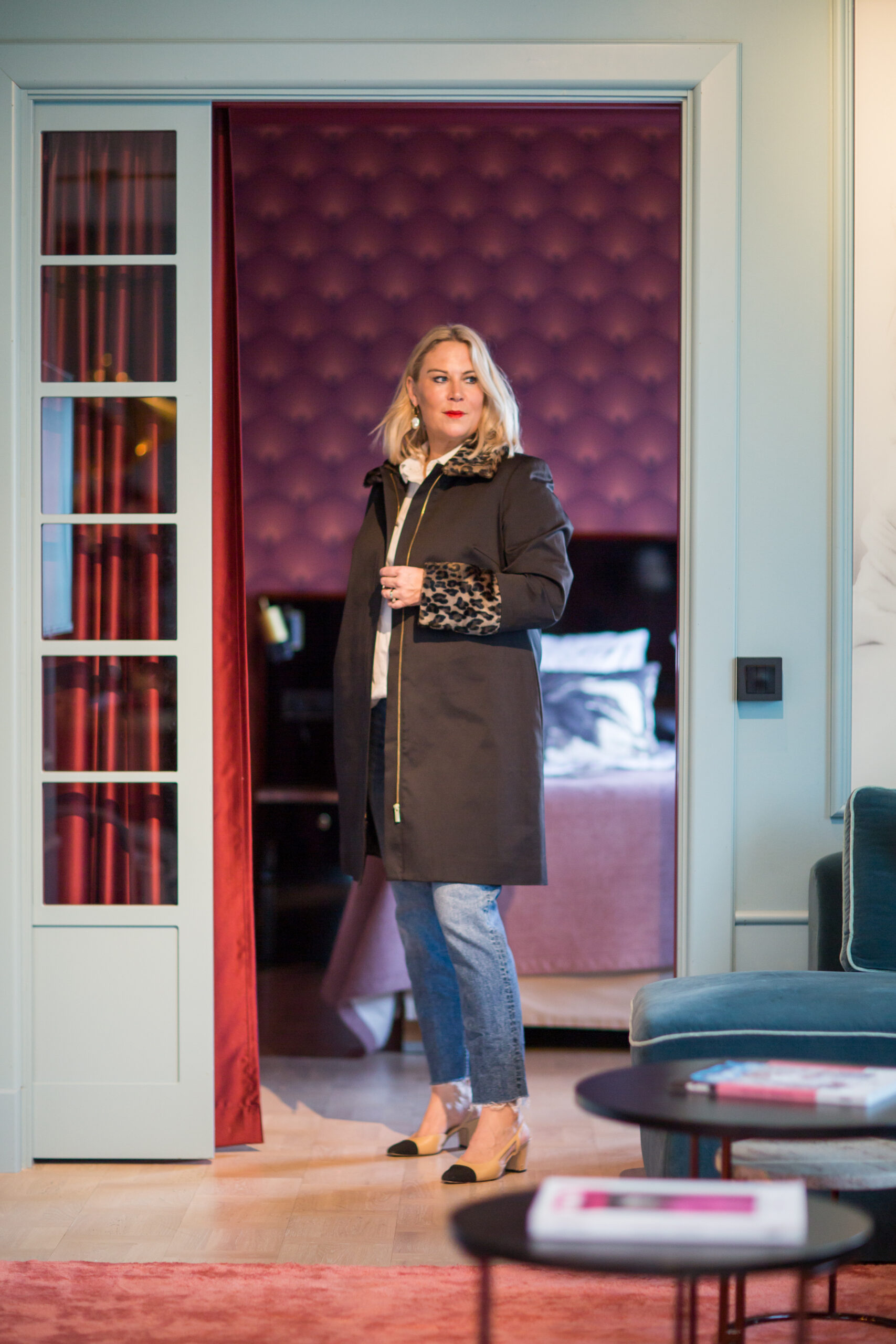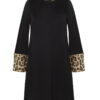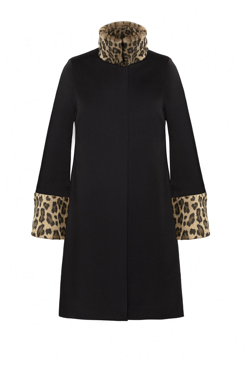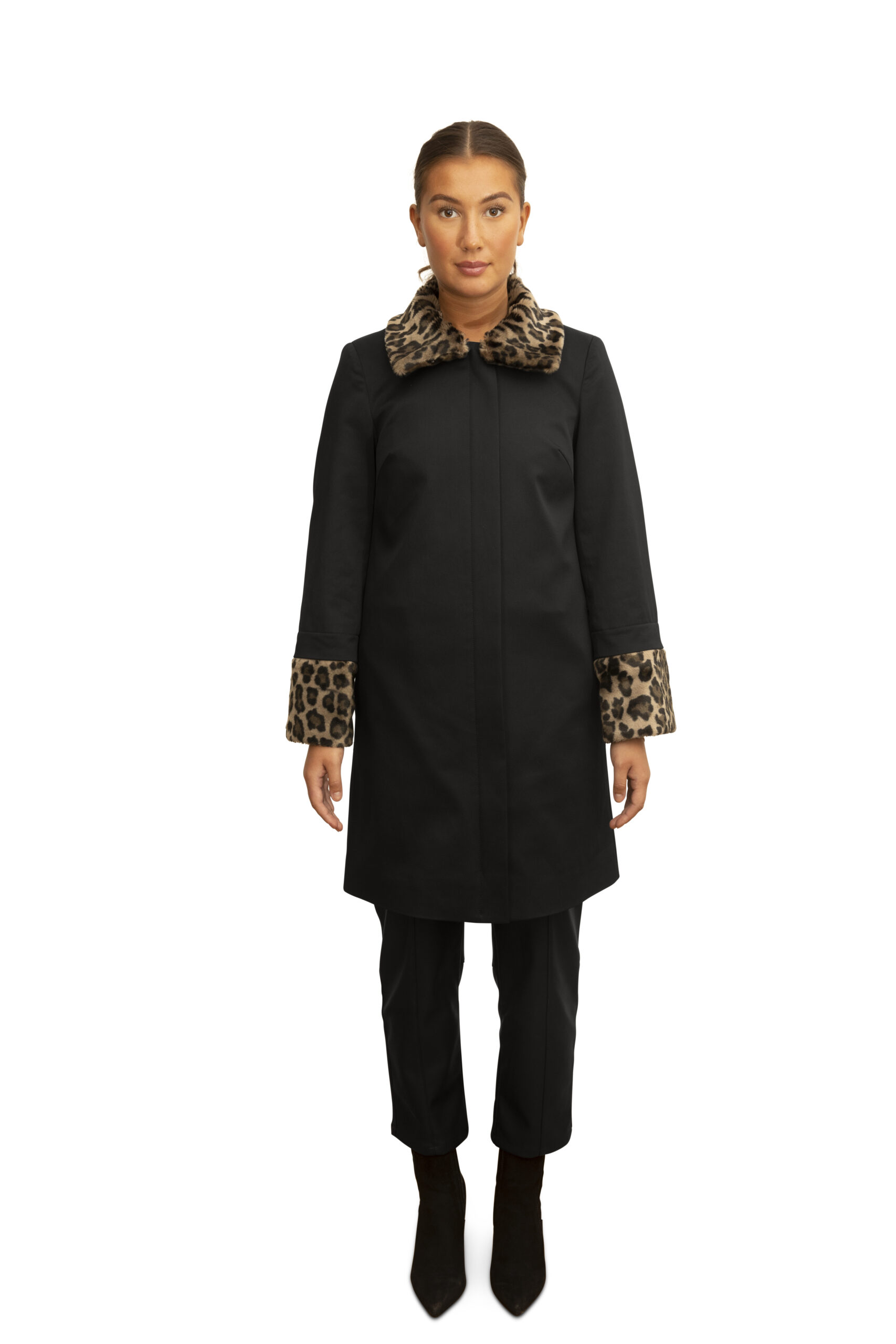 This black woman´s coat will be an excellent essential of your wardrobe, meanwhile detachable collar and sleeves, provide you endless variations. This is a key design of our limited edition developed in collaboration with Susanne Histrup – an entrepreneur and mother of four. It has an above-knee length and a beautiful detachable leopard faux fur sleeves and collar to protect you in a windy days. Hidden zipper closure. Fully lined. Made in Europe.