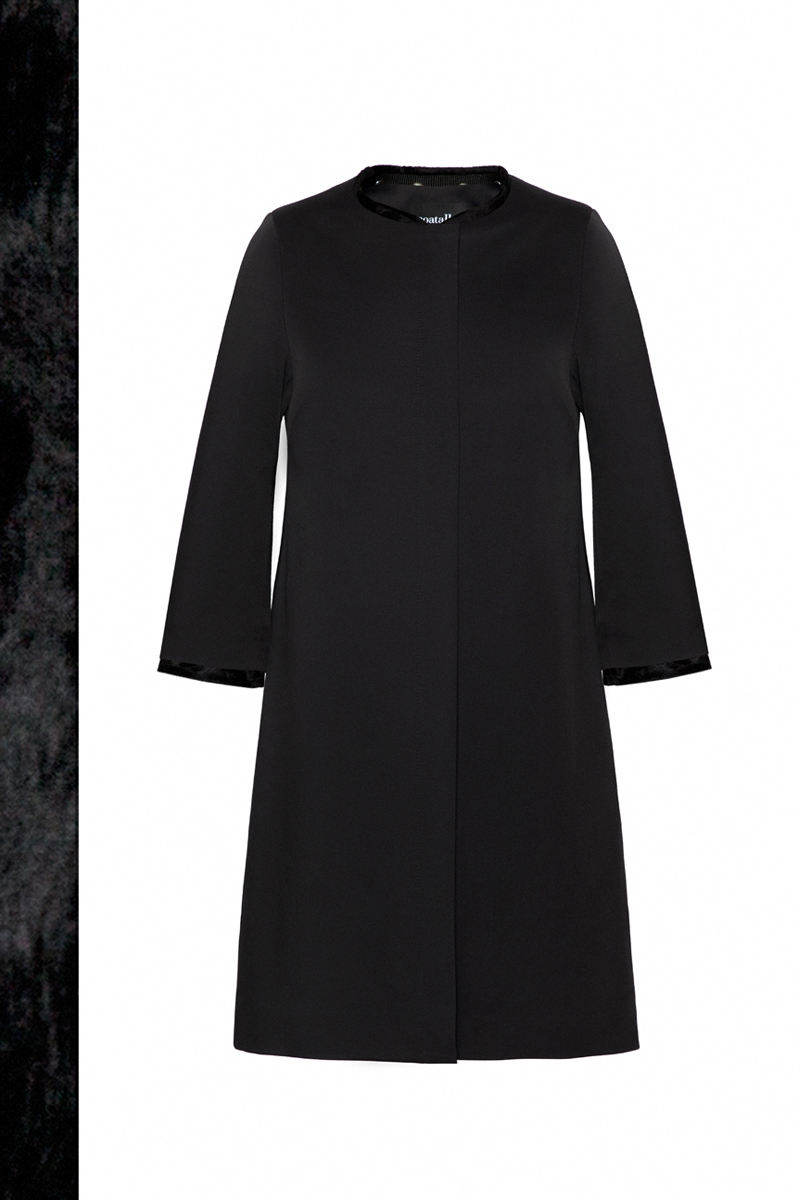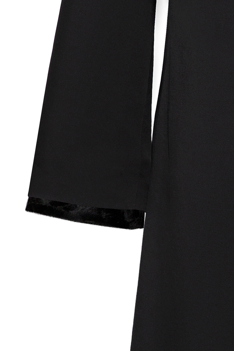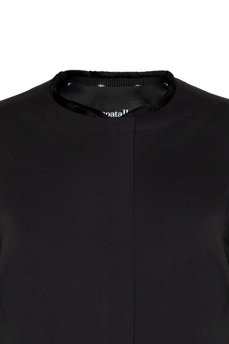 This classical black coat with its detachable short faux fur decorative collar and ¾ sleeves offers a unique look in casual combination. Above-knee length. Concealed YKK zipper closure on the front. Fully lined.